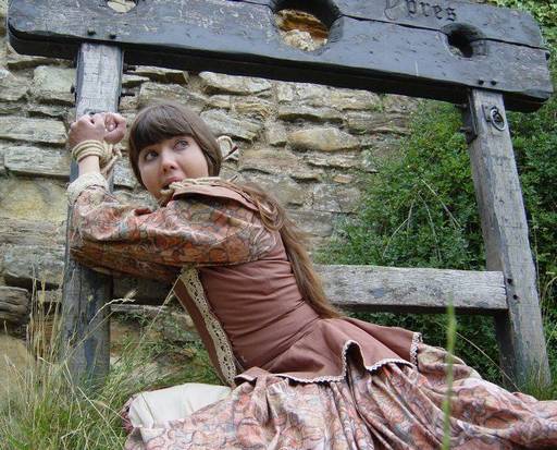 That’s unusually effective movie-bondage (assuming the ropes are secured to that post, as opposed to her just leaning against it). Nothing in a movie annoys me more than a rope tie that the actress could escape in two seconds as soon as the director shouts “Cut!” Oh, and is that a rope gag? Hard to tell from this shot. I’m guessing whoever put her there lacked a key to unlock the pillory, and just left her there so the village Lord Mayor (or whoever) could properly pillory her later.