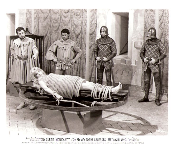 This rope-enveloped heroine is from a lobby card from the 1967 Italian comedy On My Way to the Crusades, I Met a Girl Who… (also released as “The Chastity Belt”).